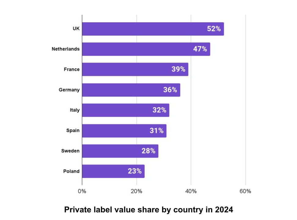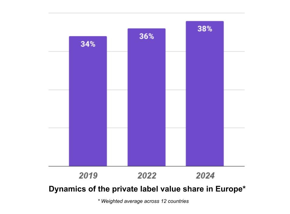 Los productos de marca propia tienen una presencia sorprendentemente fuerte en Europa, con una cuota de mercado promedio de casi el 40%. Aunque esta cifra varía significativamente según el país, está creciendo constantemente, aumentando 4 puntos porcentuales desde 2019.