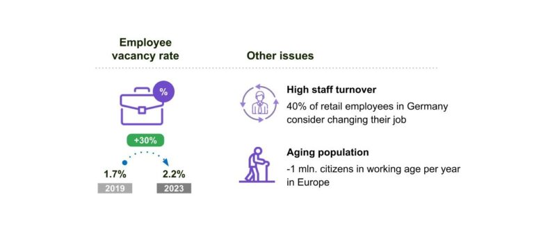 ¿Sabías que con el envejecimiento de la población, el número de ciudadanos de la UE en edad laboral se reduce en 1 millón cada año? Esta tendencia afecta la capacidad de los minoristas para reclutar nuevos empleados, lo que conduce a un aumento de las vacantes y alta rotación de personal.