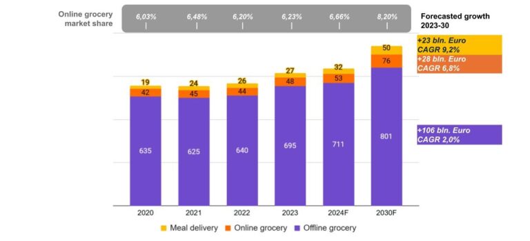 Sin embargo, mirando los números proporcionados, no me parece tan obvio. La cuota de mercado de los canales de alimentación online ha aumentado solo marginalmente desde 2020. La proyección para 2030 muestra una tasa de crecimiento más alta, pero en términos absolutos el canal offline crecerá dos veces más que la combinación de alimentación online y entrega de comidas. Por lo tanto, las tiendas físicas seguirán presentes y continuarán proporcionando más del 90% del volumen de ventas en los próximos años.
