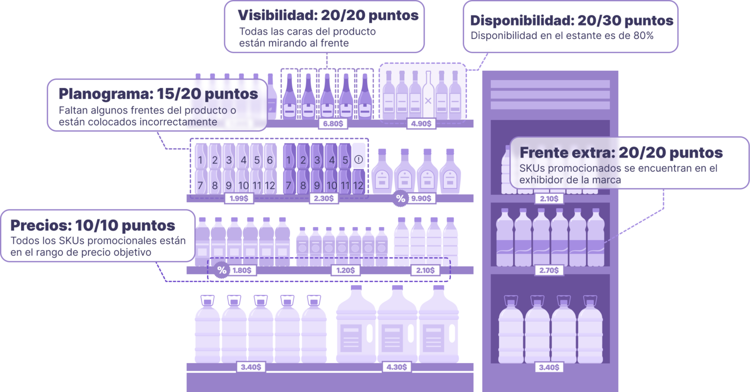- Permite el cálculo automatizado de puntajes de salida, que de otro modo serían extremadamente difícil de funcionar manualmente. Por ejemplo, se considera hacer el cálculo de la participación en el estante en una categoría con cientos de productos mirando al frente. Esta automatización optimiza el proceso, lo cual hace todo más fácil y significativamente más rápido.